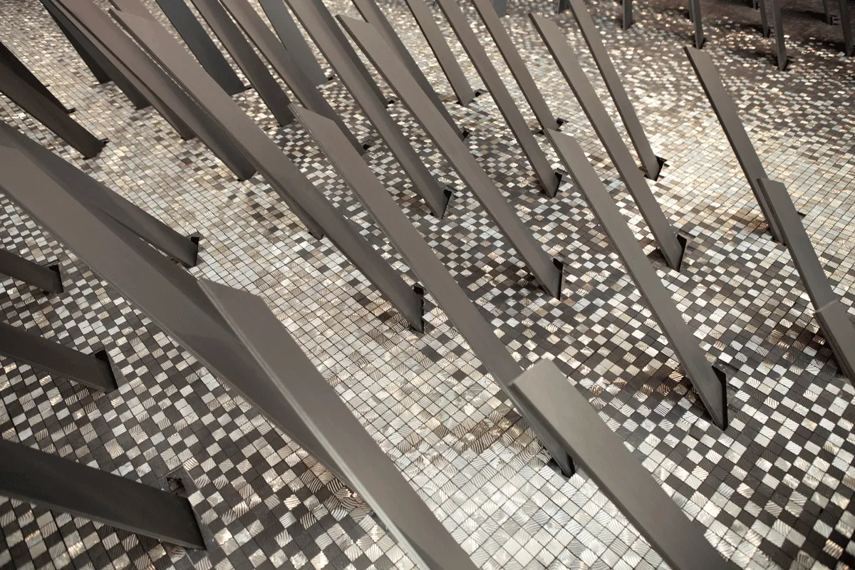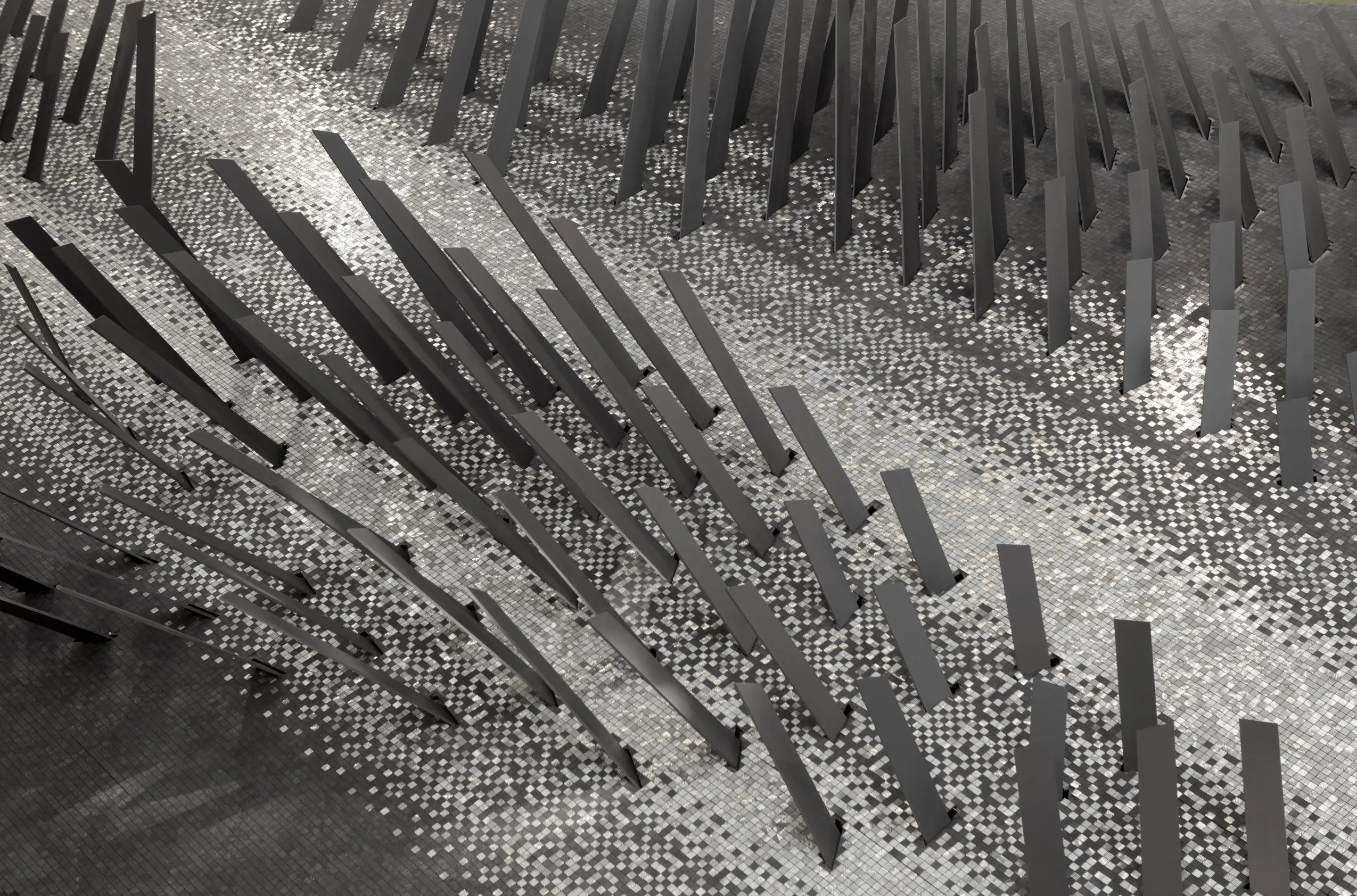 Para generar dicho efecto se creó una simulación digital por medio de software paramétrico que se materializo con cerámica, permitiendo coordinar y relacionar sistemas constructivos (pavimento y lamas auto portantes).
