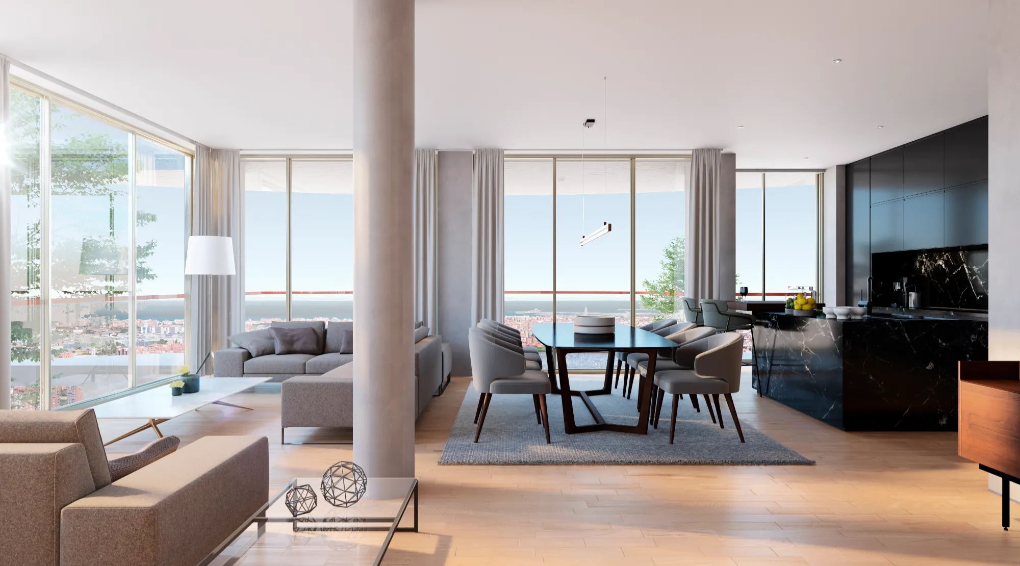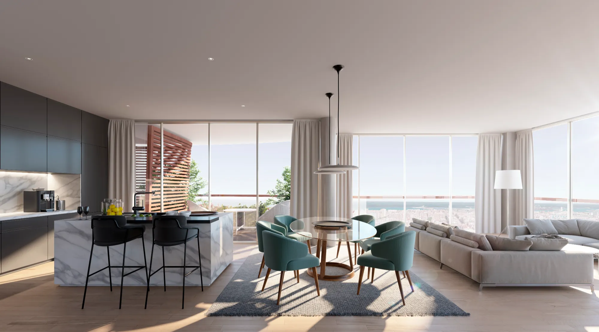 En un primer nivel, nos hemos centrado en el modo de habitar una edificación en altura, generando viviendas que maximicen las cualidades de vivir en una torre, potenciando las vistas, terrazas e iluminación natural.