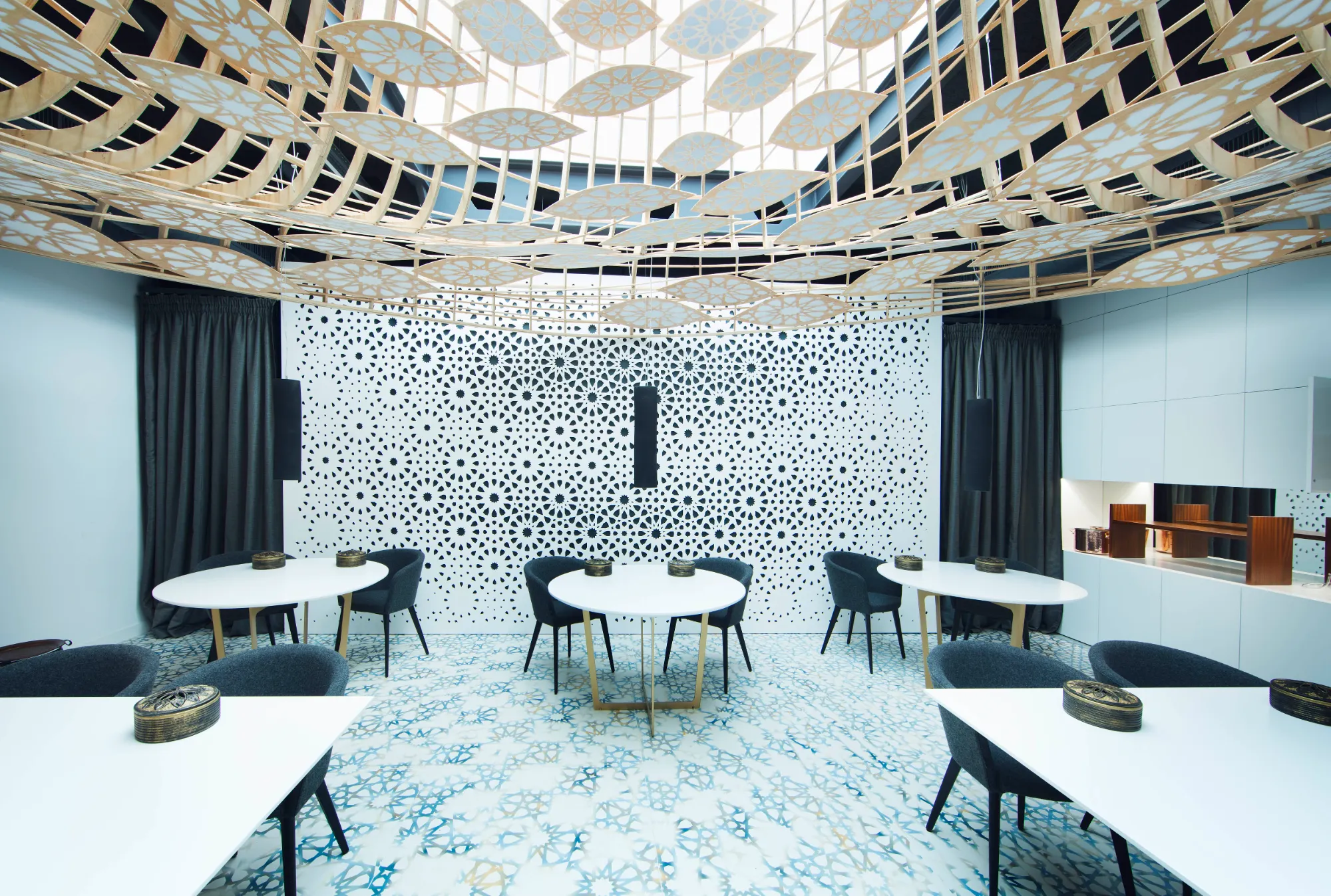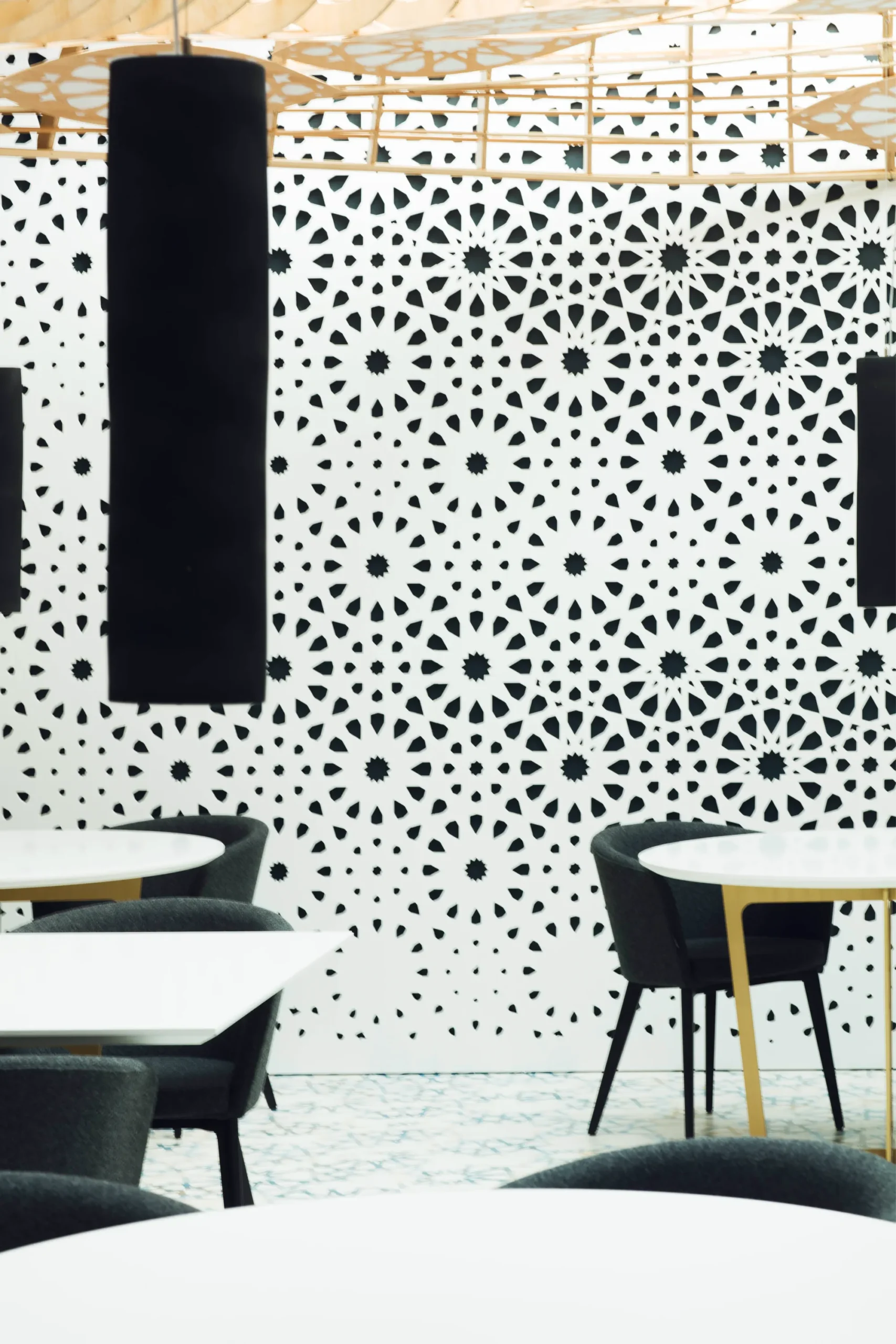 Noor opera de una manera similar, el exterior es una piel de cerámica con geometrías afiladas, en esta caso flechas generando gradientes marcando la entrada. Que contrasta con las geometrías y patrones más amables y colorista del interior.