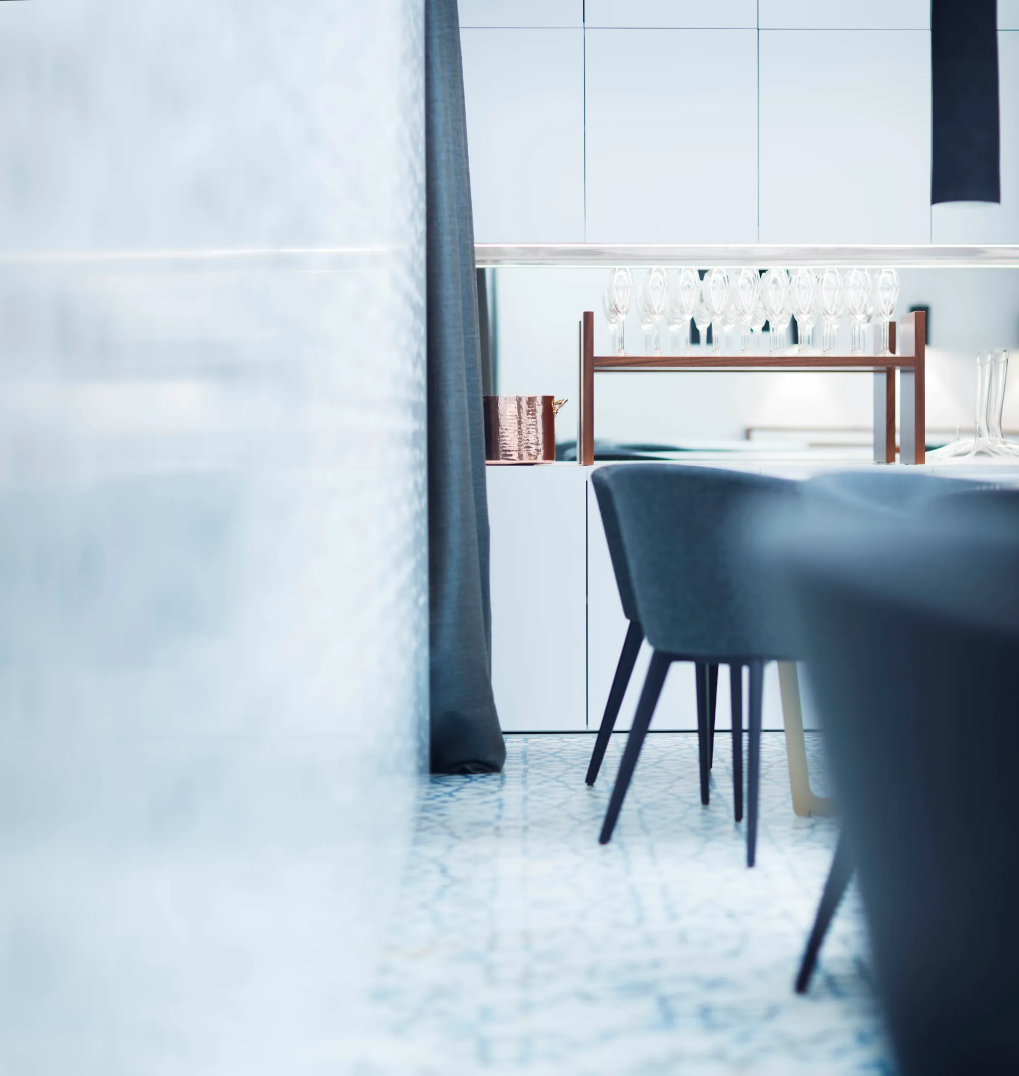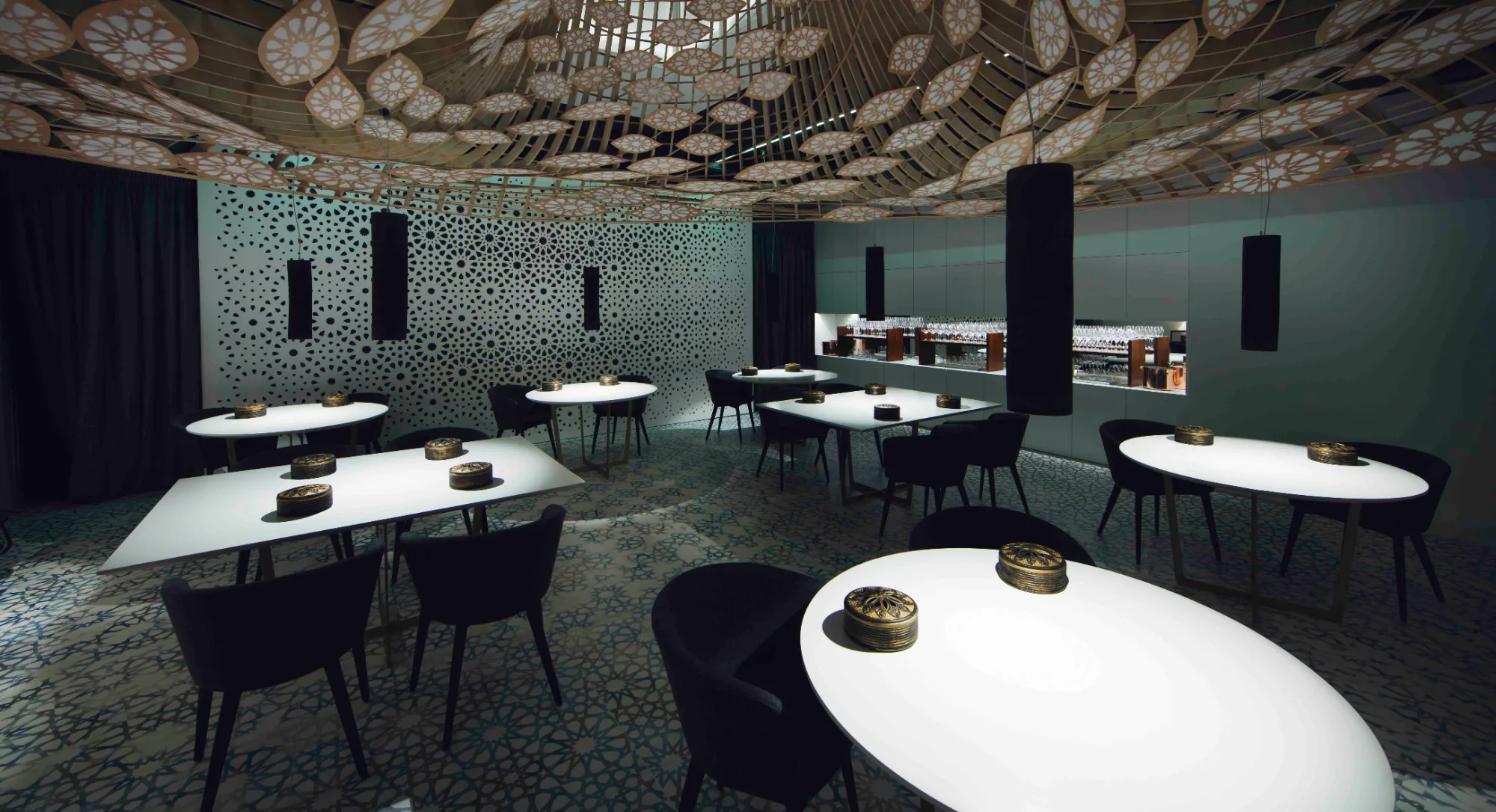 Los palacios y complejos edificativos árabes se organizan claramente en la secuencia de espacios, el orden y el ritmo son muy importantes en la experiencia espacial, de forma análoga en noor la secuencia espacial es fundamental para construir la experiencia gastronómica, desde la calle con la fachada, la entrada, la sala, cocina y espacio creativo, todo está unido pero claramente diferenciado, en una secuencia espacial continua donde cada espacio tiene un carácter diferente, generando una sensación de profundidad y fluidez.
