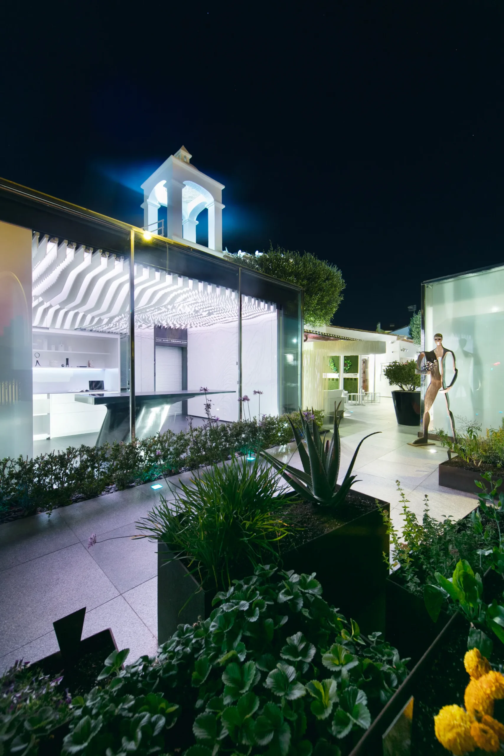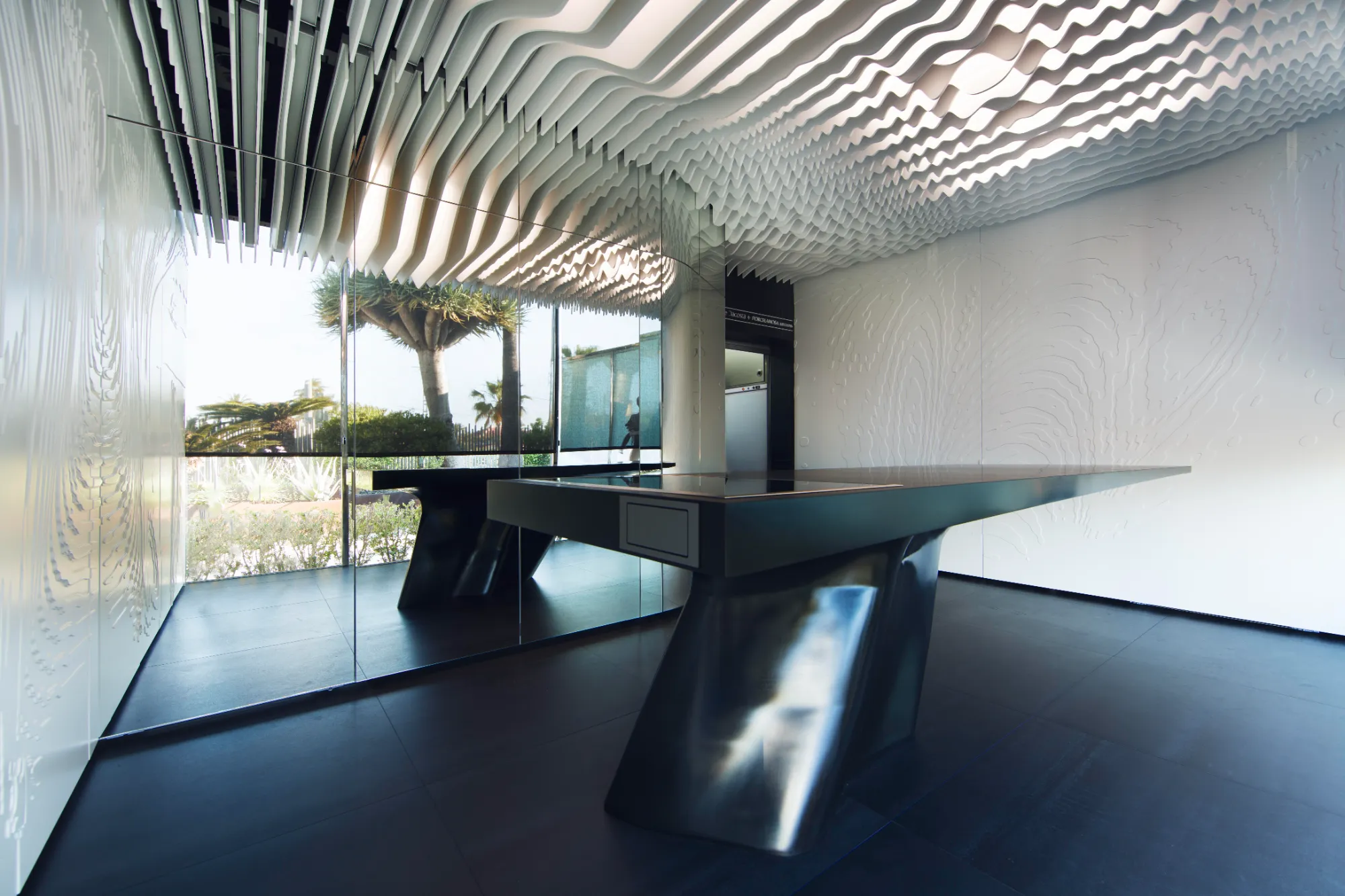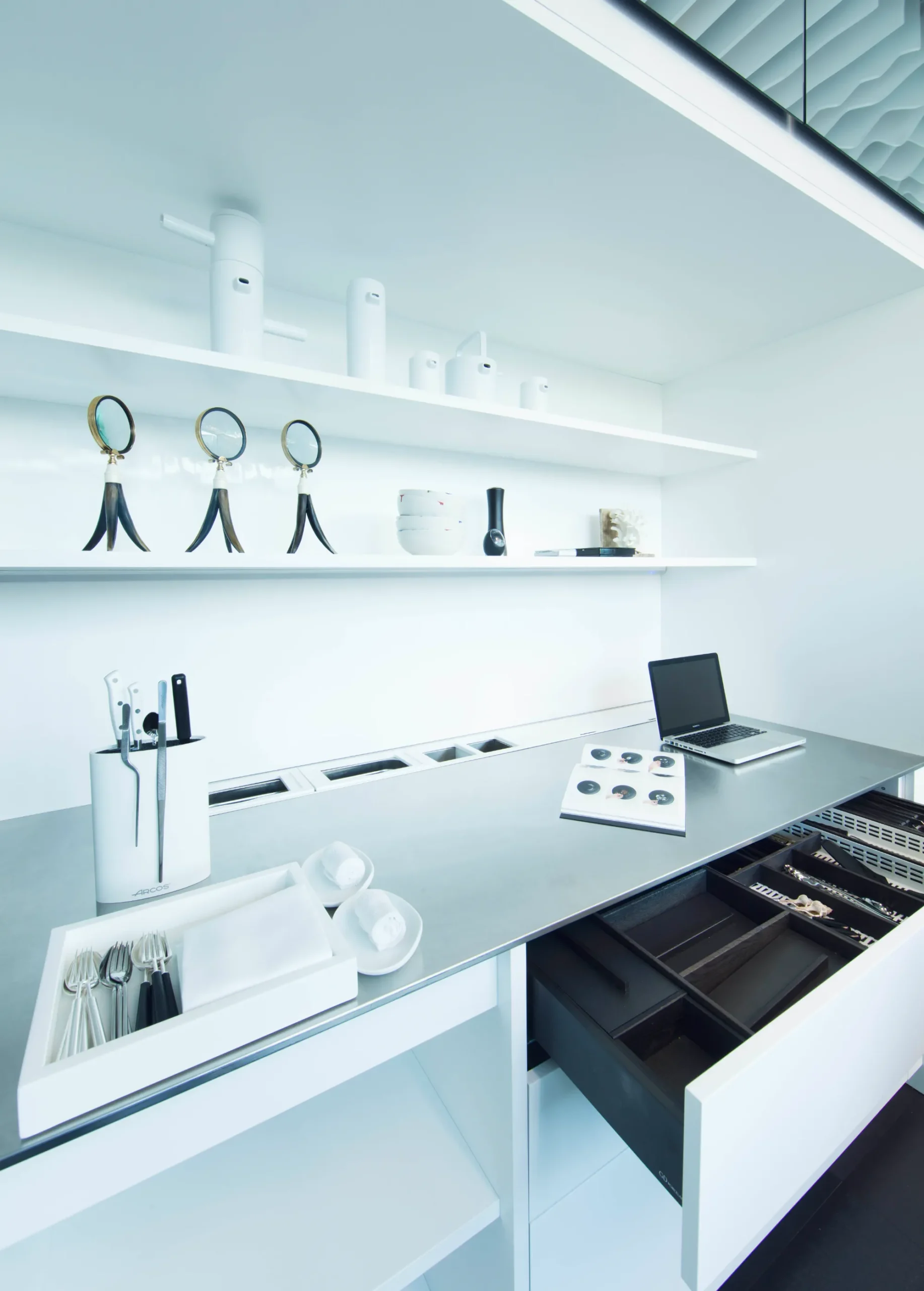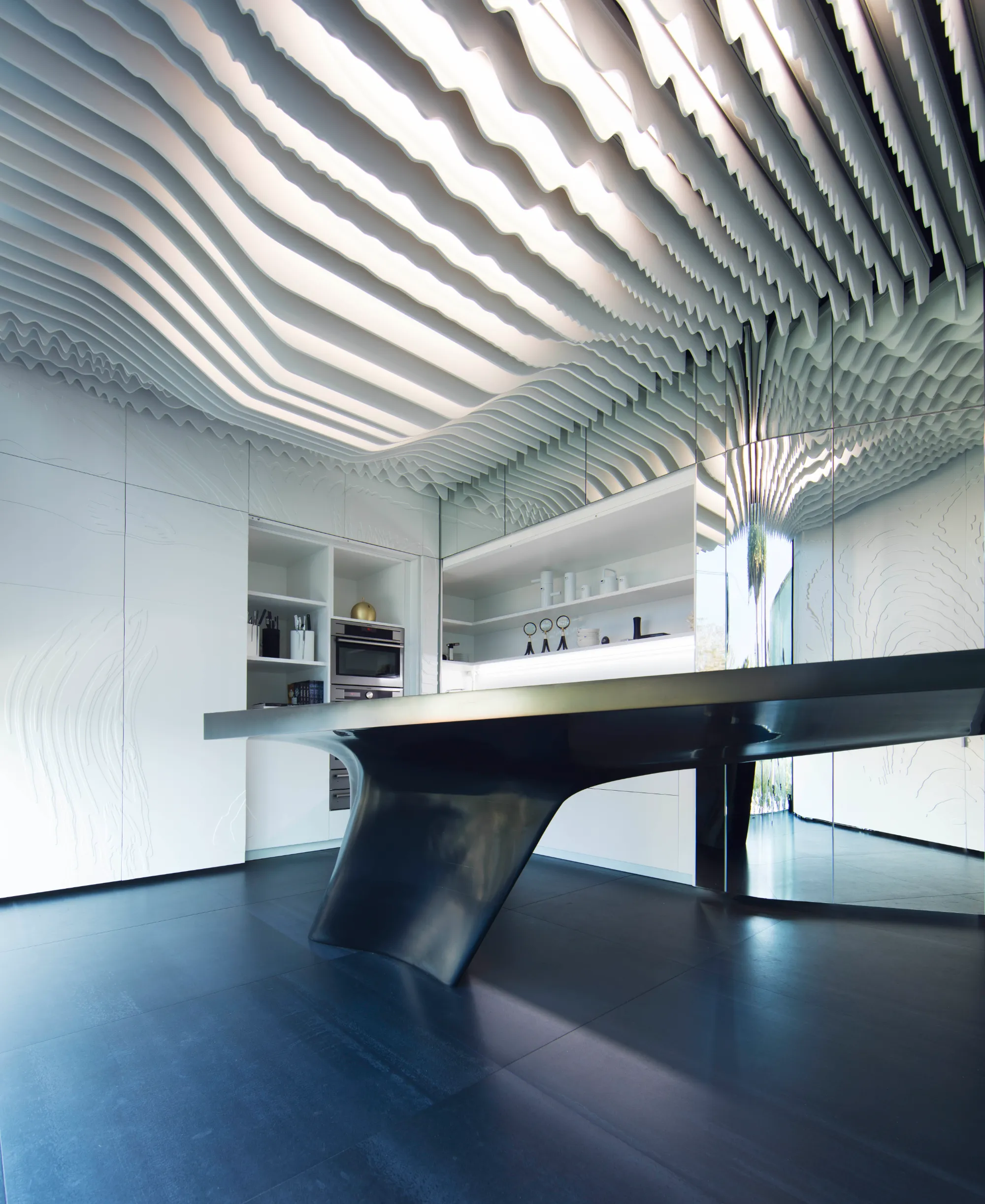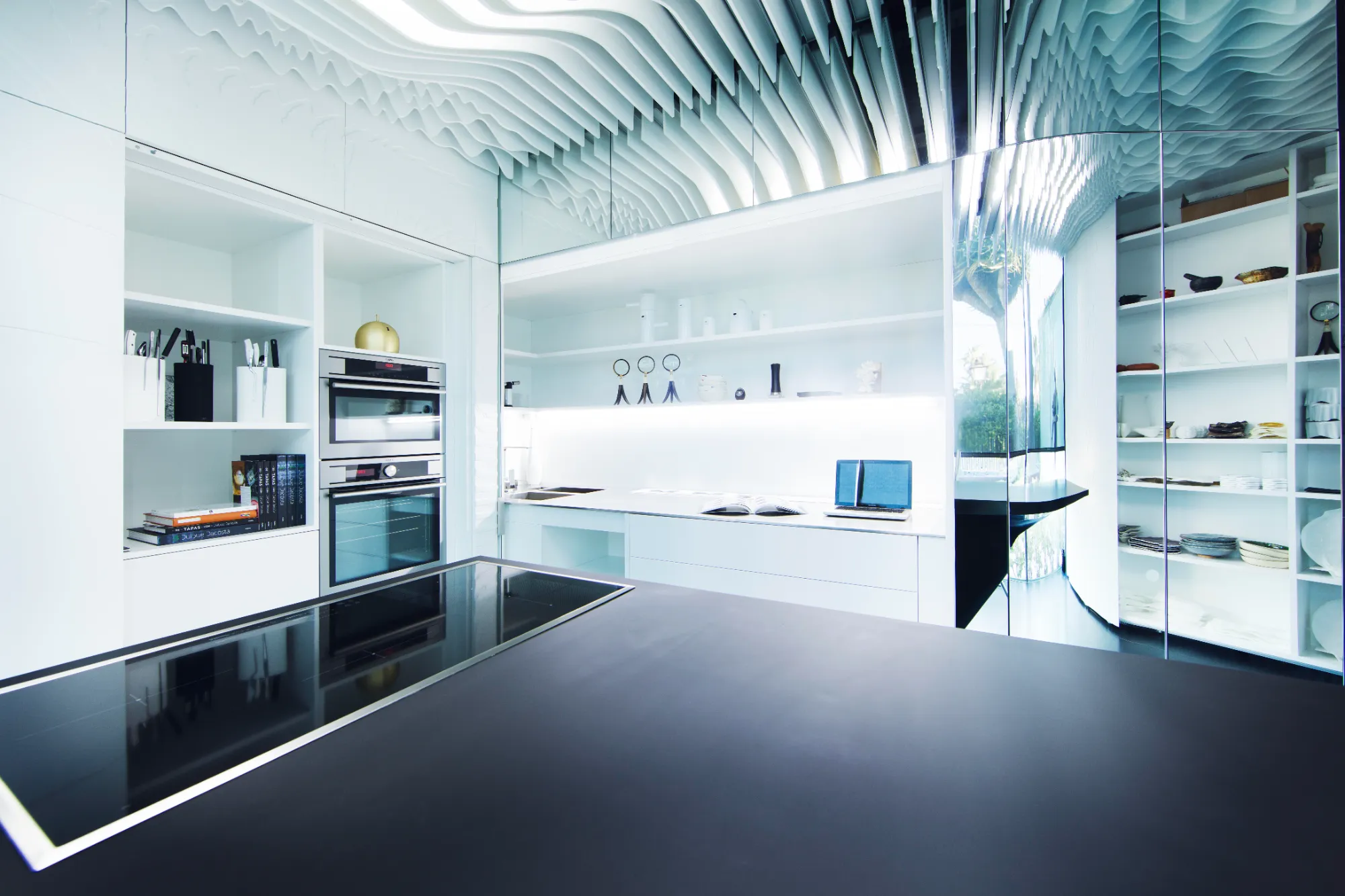 2_techo técnico, el techo con las lamas de Krion blanco generando un paisaje que alberga gran cantidad de tecnología para la ambientación del espacio, como la campana, climatización, iluminación y sonido, el objetivo era dotar al espacio de la máxima versatilidad posible, para poder dar respuesta a las necesidades tanto creativas como funcionales, tanto iluminación como sonido están integrados en la red y controlados domóticamente, los cerca de 2000 vatios totales de iluminación LED son controlados por un sistema dual, compuesto por un panel táctil con protocolo DMX y permite la creación y almacenaje de múltiples variaciones en el control de los parámetros que dan forma a las escenas. A su vez es posible el control unificado, de iluminación y sonido (compuesto por 4 altavoces hi-fi), a través de tablet, facilitando la movilidad en el espacio sin renunciar al control total de la tecnología.