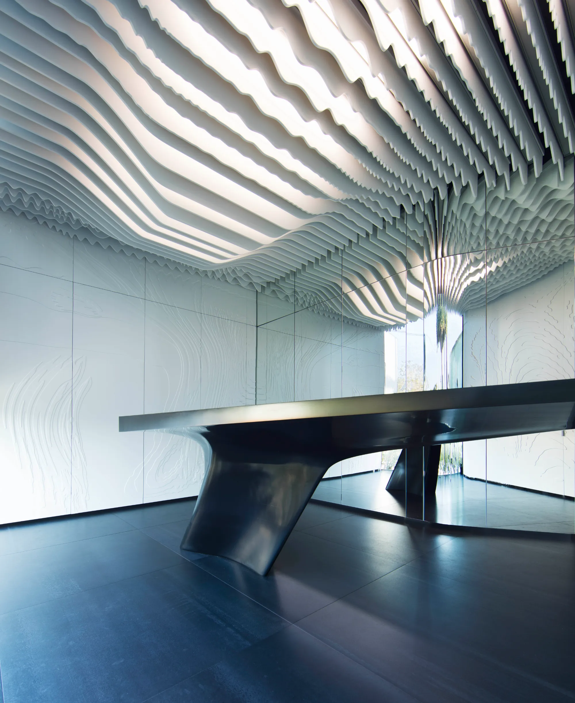 En las puertas-paredes se han utilizado dos estrategias, la pared del fondo es de espejo para ampliar el espacio y las laterales son un corte topográfico generando un paisaje continuo con el techo.