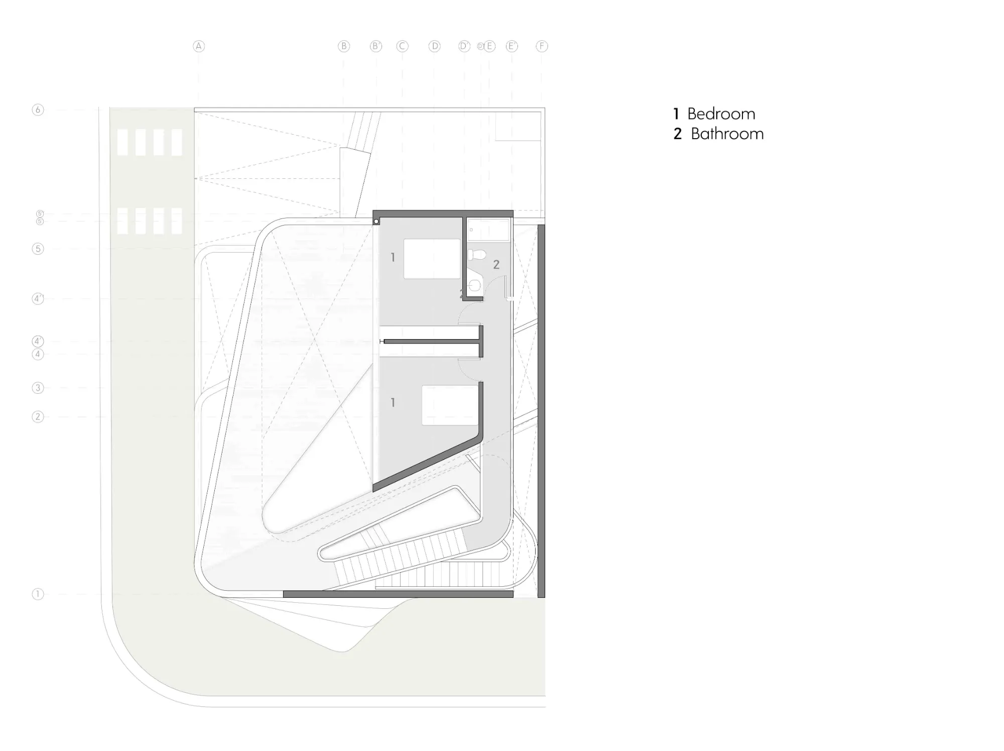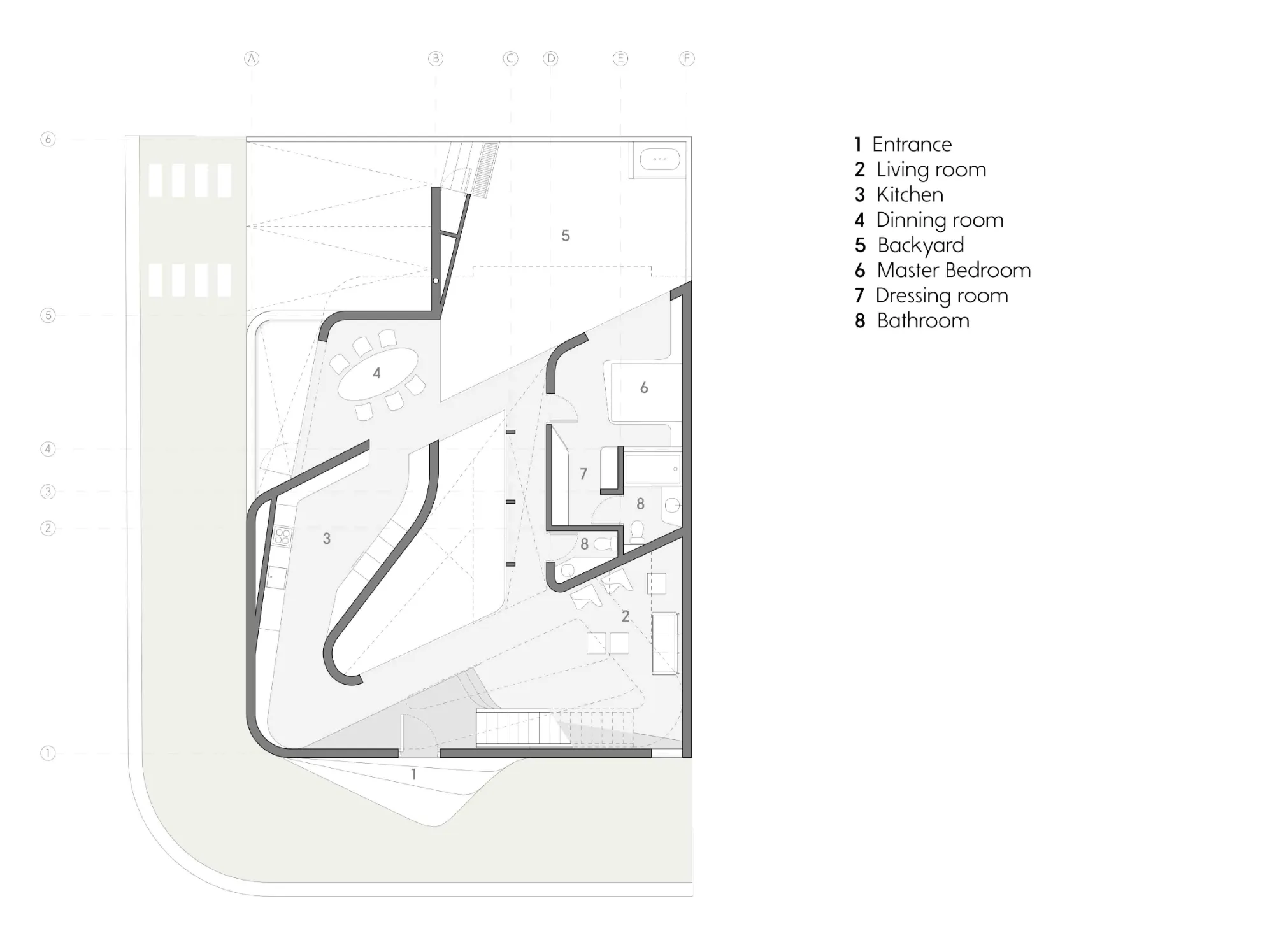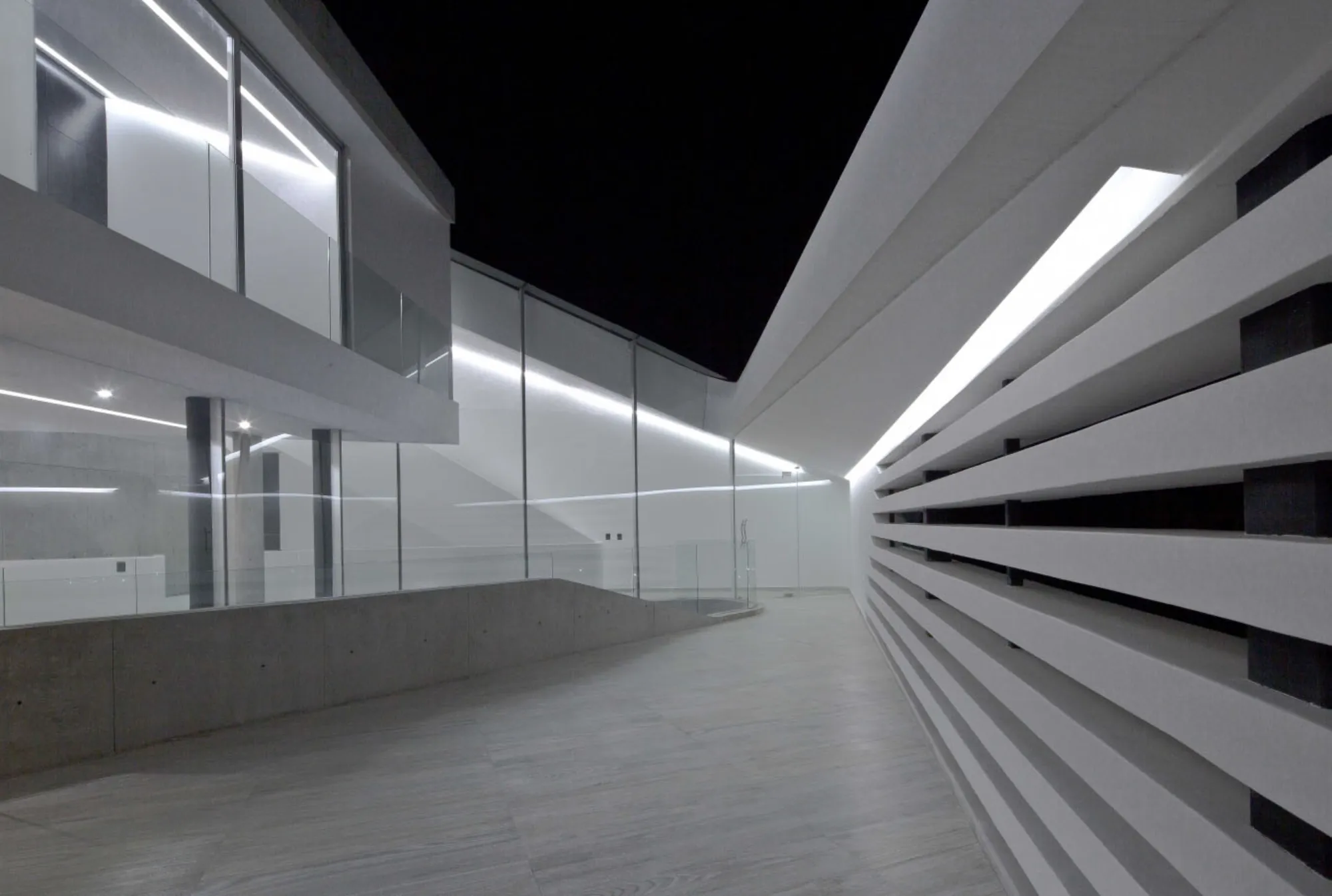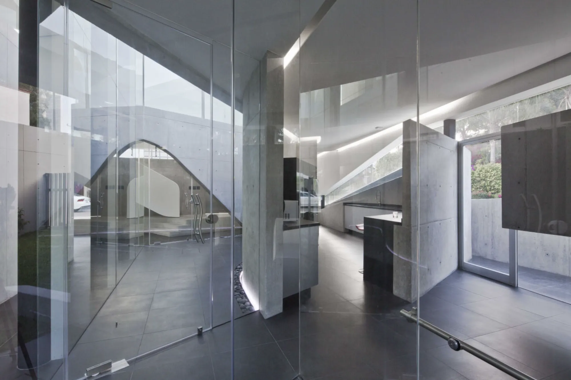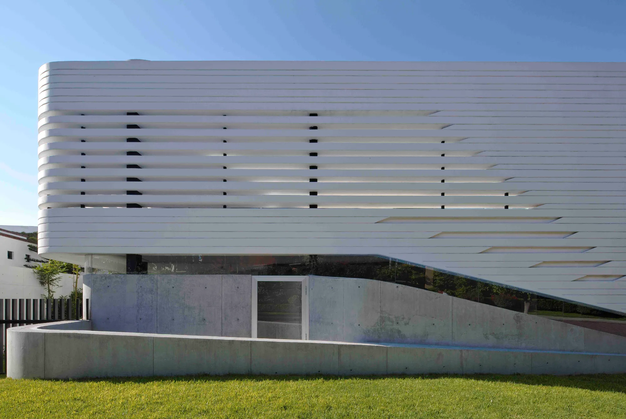 El volumen inferior está formado por una serie de muros orgánicos fluidos de hormigón visto que desafían la gravedad coreografiando la división del salón, cocina, comedor y la habitación principal al tiempo que sirven de soporte base de la casa.