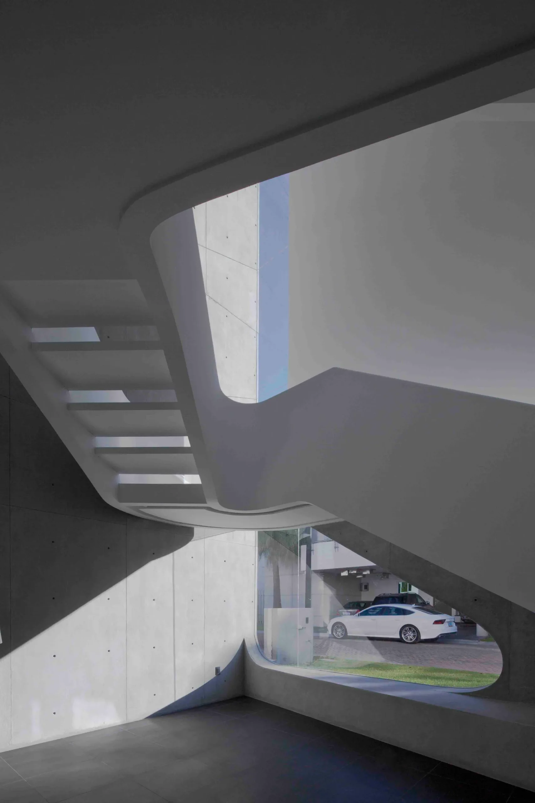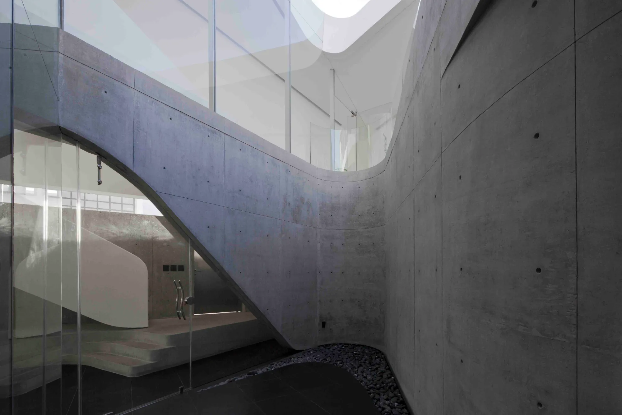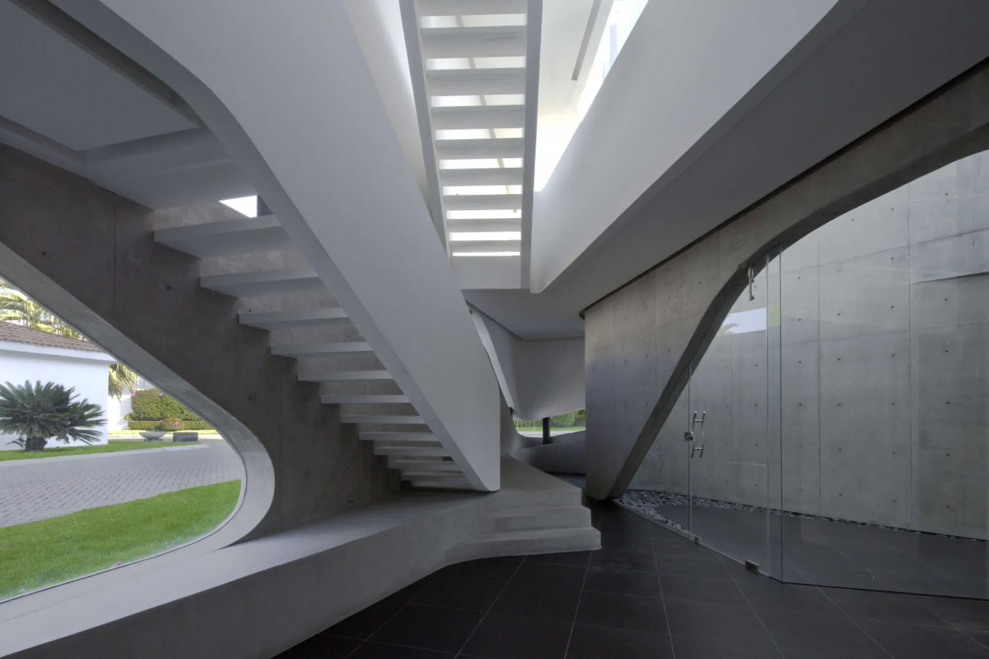 A diferencia de los principios de organización tradicionales definidos por paredes, puertas y pasillos, en Vortex, la circulación es orgánica y continua visualmente, conectando los espacios interiores y exteriores a través de muros curvos y aperturas orgánicas que se unen por medio de una audaz escalera que atraviesa el erosionado espacio interno.