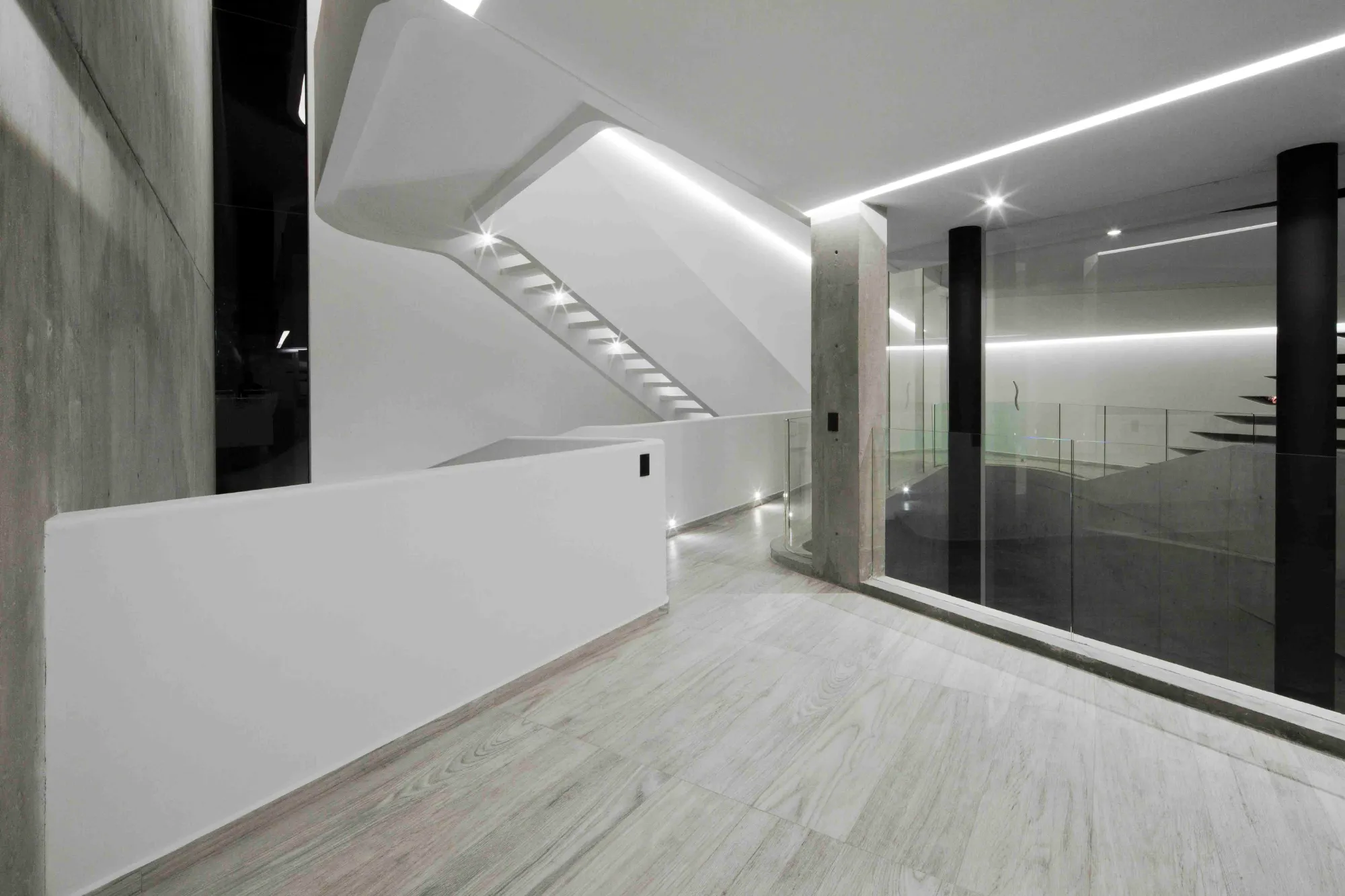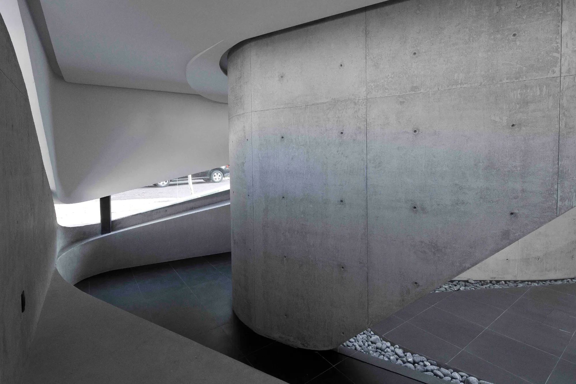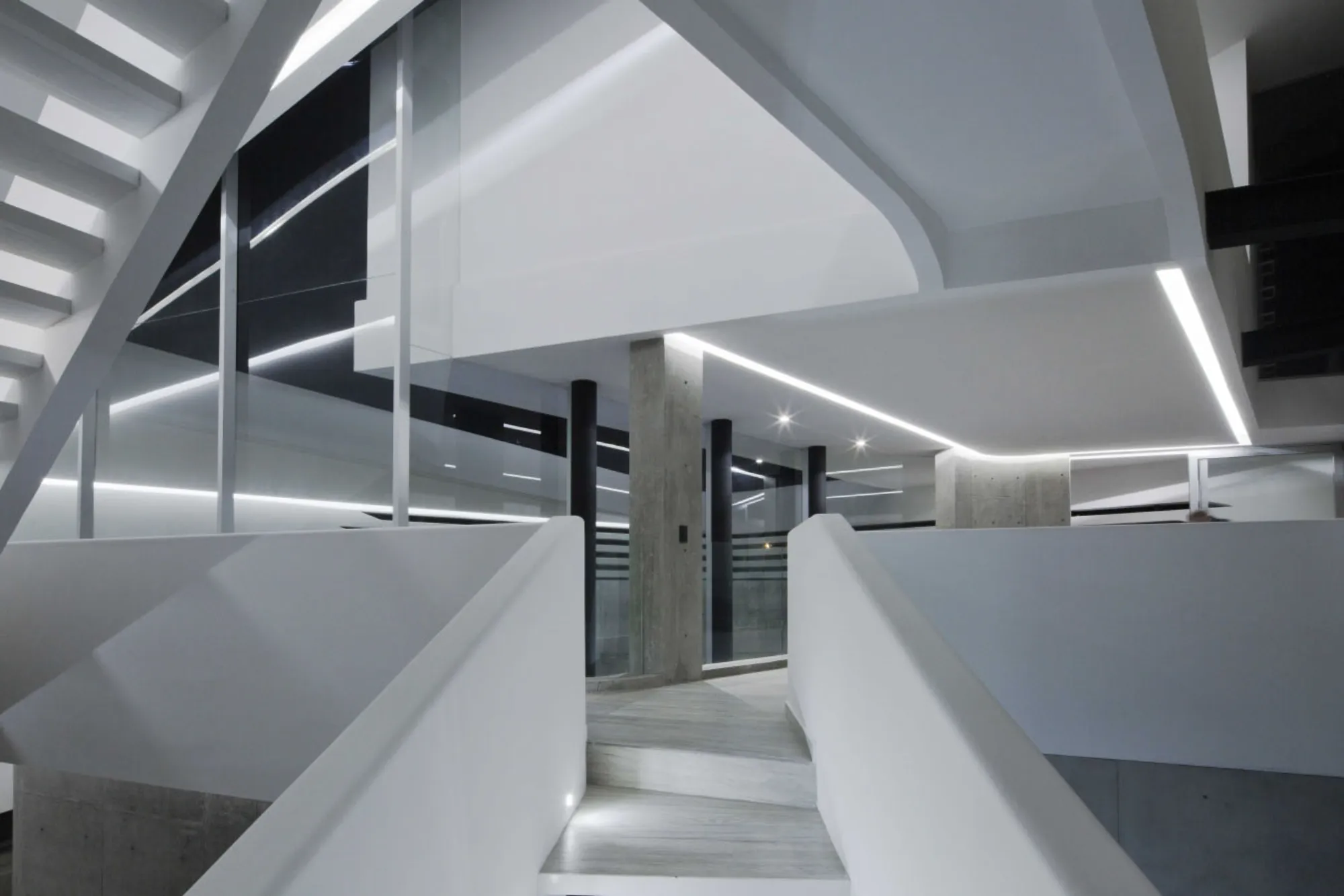 A diferencia de los principios de organización tradicionales definidos por paredes, puertas y pasillos, en Vortex, la circulación es orgánica y continua visualmente, conectando los espacios interiores y exteriores a través de muros curvos y aperturas orgánicas que se unen por medio de una audaz escalera que atraviesa el erosionado espacio interno.