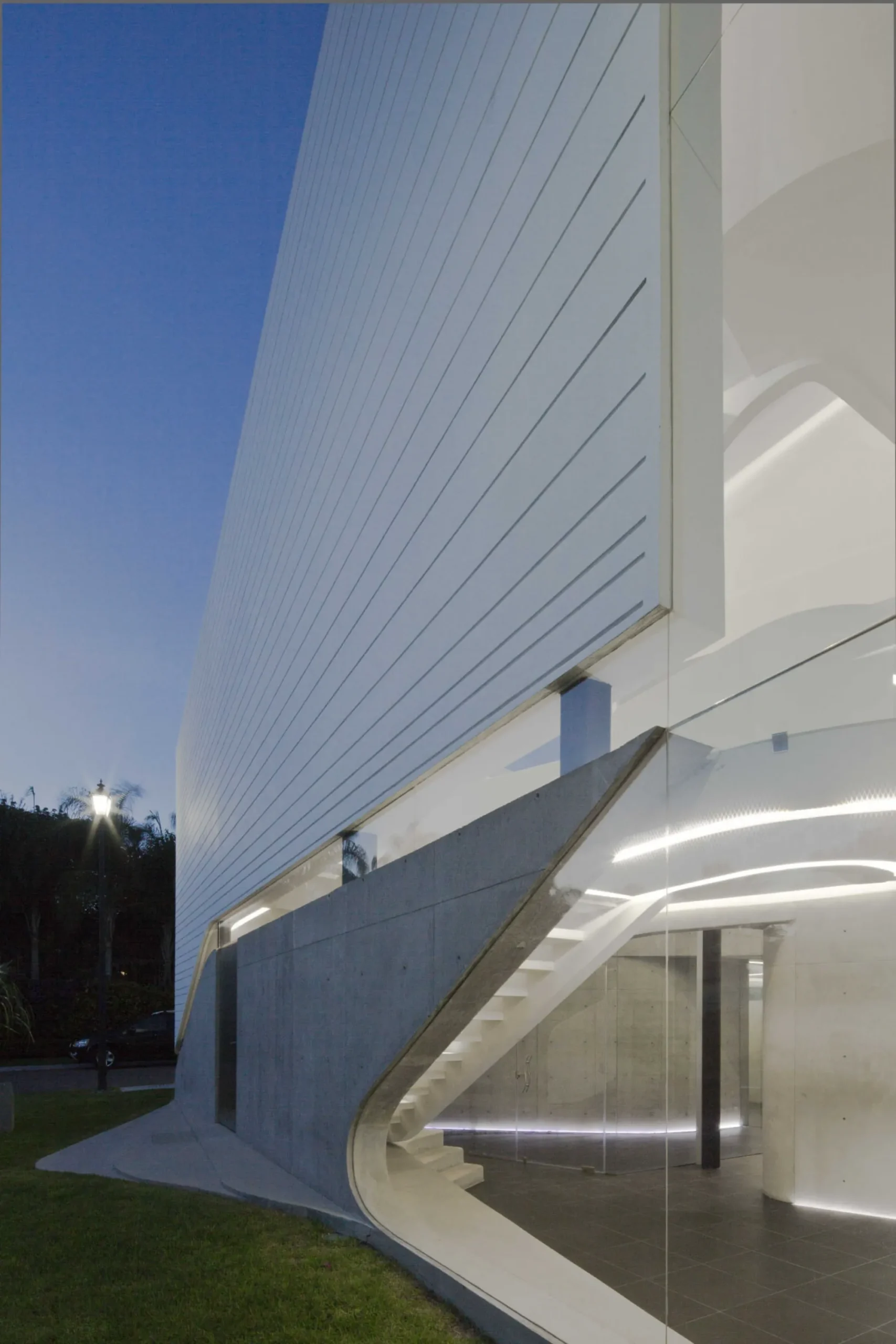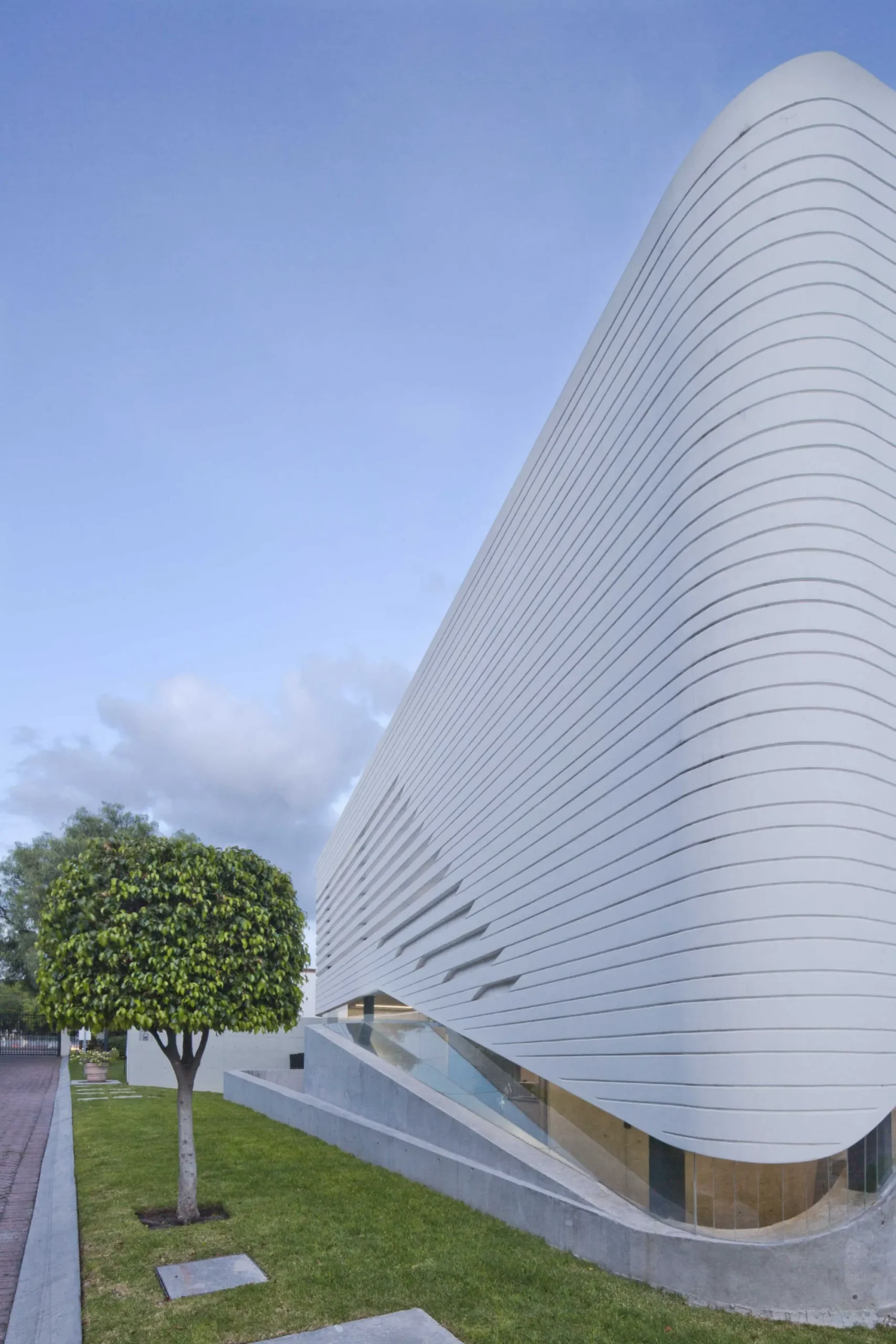 La circulación en vórtice se expresa en el exterior a través de los distintos volúmenes que están suavemente entrelazados por franja de vidrio, estos volúmenes se enfatizan debido a su diferente materialidad y sistema constructivo.